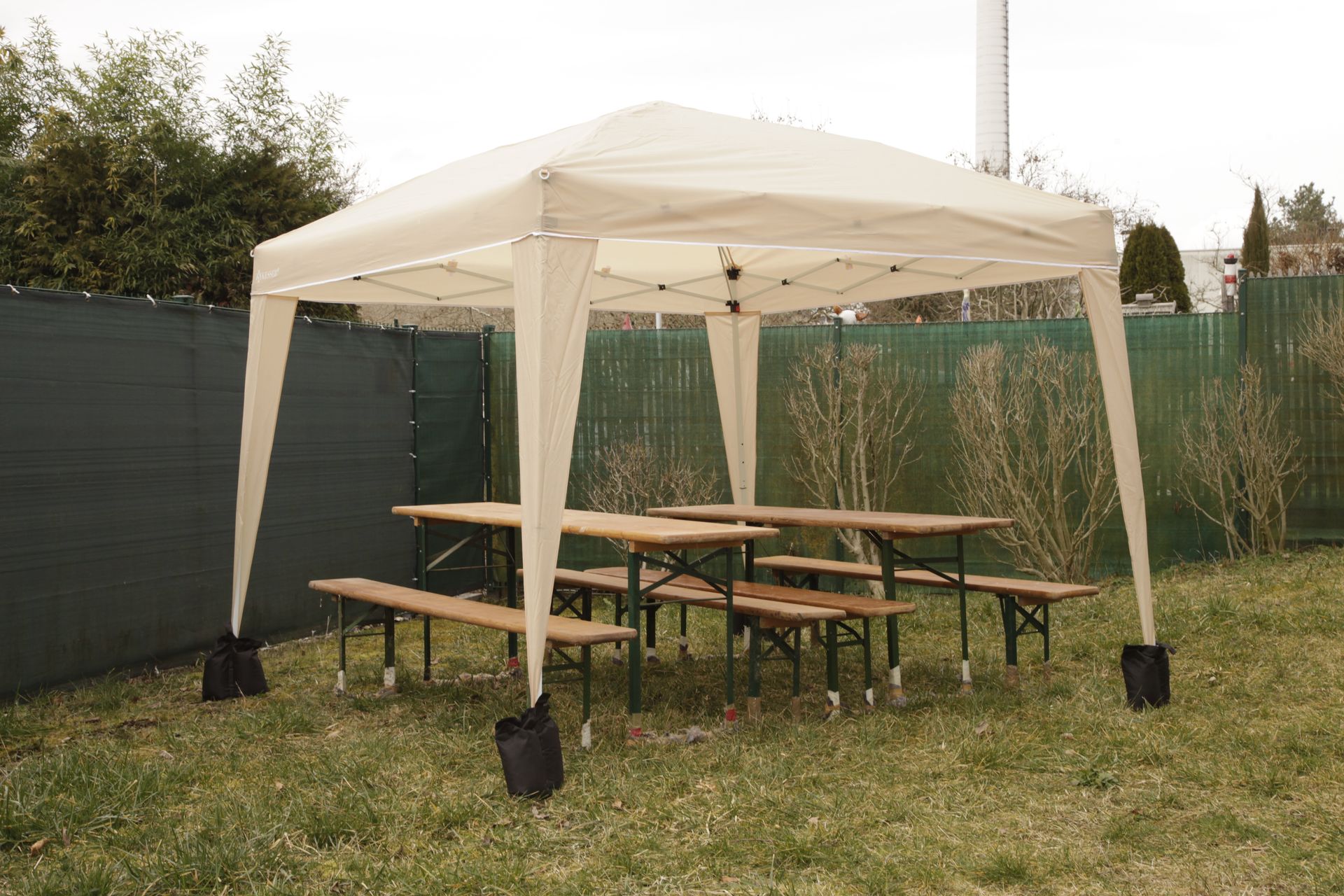Incl. eines Popup-Zeltes oder zwei Sonnenschirmen und 4 Alu-Stehtische.
